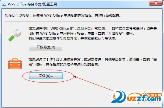 4、进去之后可以看到弹出一个新的对话框【wps office 综合修复/配置工具】,选择【高级】;