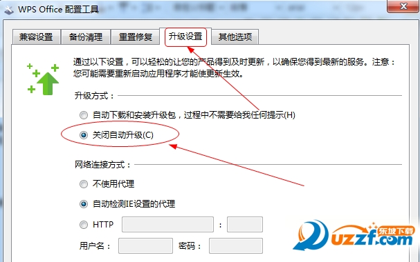 5、选择【升级设置】里面将升级方式选择为关闭自动升级,自己升级的话有很多的广告以及插件,这些都是会天天弹出来,非常的麻烦;