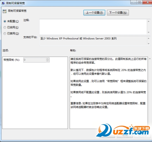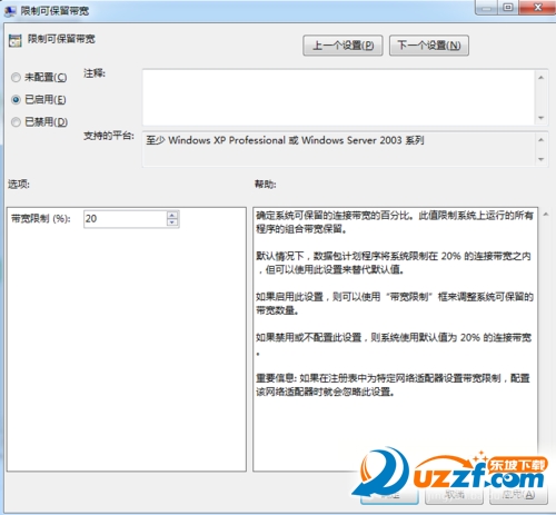 然后双击限制可保留宽带,进入配置界面后,我们可以看到如果限制了网速,会显示已启用,然后下面显示20%.