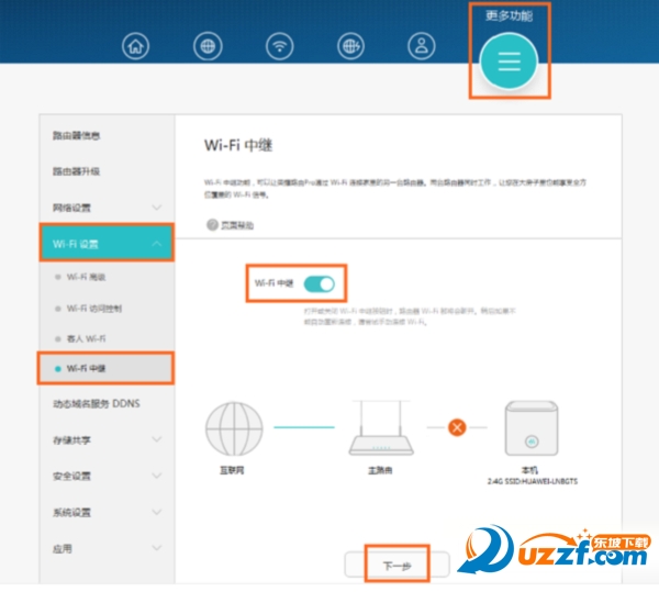 2、点击“更多功能”——>“Wi-Fi 设置”——>“Wi-Fi 中继”——>打开“Wi-Fi中继”——>点击“下一步”。