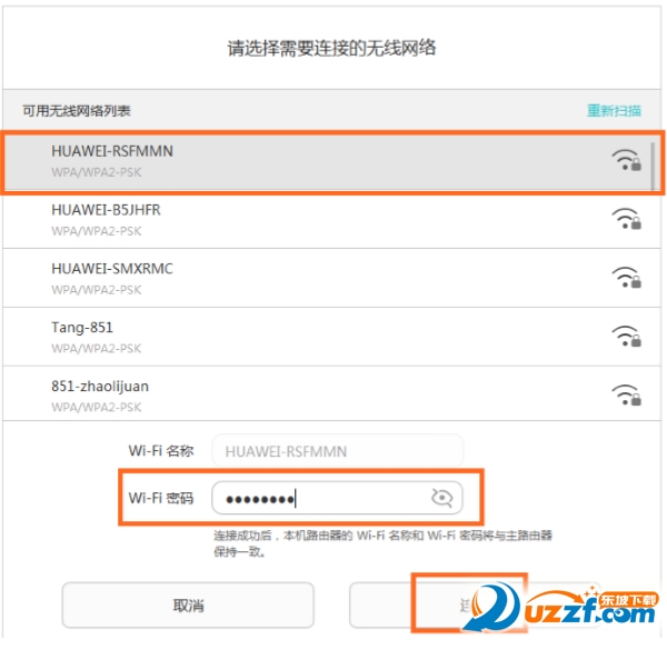 3、在“可用无线网络列表”选项中,选择原路由器上的无线网络——>输入原路由器无线网络的密码——>点击“连接”,如下图所示。