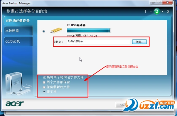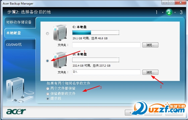 2,本地磁盘:选择准备保存到硬盘内的位置(1),点击浏览(2)选择保存路径(和保存到可移动存储设备是选择同样的选择方法),选择同名文件处理方法(3,默认选择是"提示我")