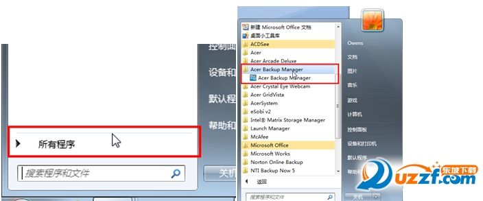 步骤一,点击屏幕左下角圆形微软徽标图案 ,选择"所有程序"-"Acer Backup Manager",运行"Acer Backup Manager"。