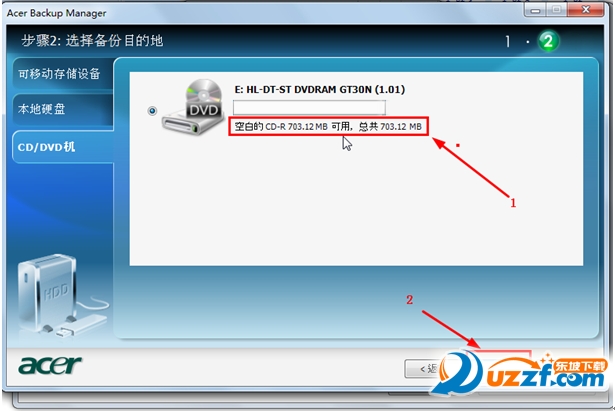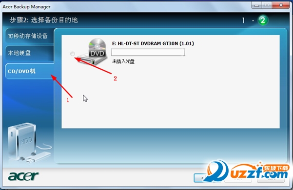 4, CD/DVD机:可以将文件备份到空白的CD或是DVD光盘上,选择CD/DVD机(1),选中刻录机(2),当未插入可刻录的光盘的时候将提示未插入光盘。