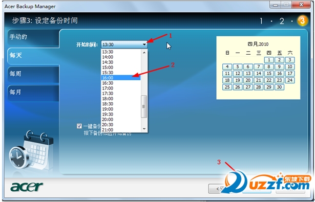 2,每天,可以在每天固定的时间备份,点击"开始时间"旁边的下拉箭头(1),选择适合您的备份时间(2),在点击保存(3)。