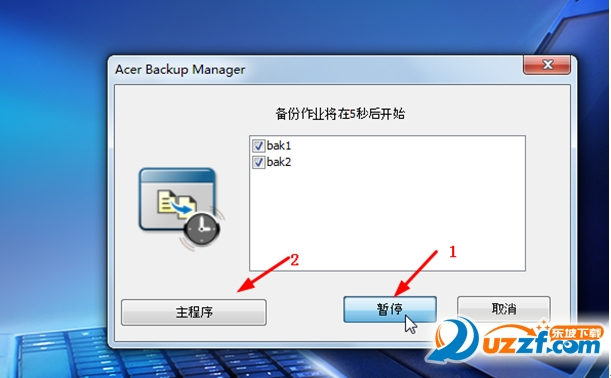在下一次使用中可以按Acer Backup Manager按钮来启动,会自动运行点了"一键备份"的备份作业,也可以点击暂停来停止(1),暂停后可以点击"主程序"(2)新建或是修改之前之前设定的作业