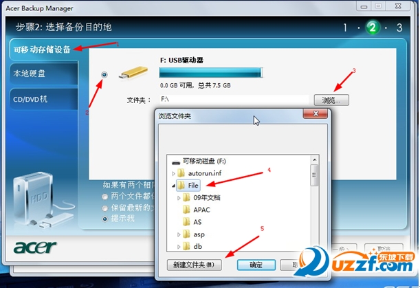 1,可移动存储设备:选中U盘或是可以移动硬盘的盘符(2),点击浏览(3),选择保存的位置(4),您也可以点"新建文件夹"(5)来建立个文件夹用来保存备份文件.,然后点击确定