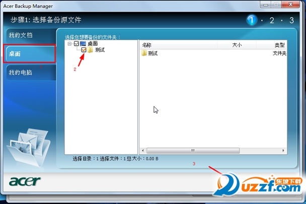 第一步:选择"备份源文件",源文件可以选择3种位置。我的文档,桌面,我的电脑