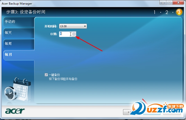 第三步,选择备份时间:备份时间设定一共有4个选项可供选择,手动,每周,每天,每月。