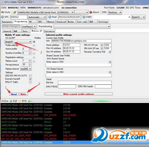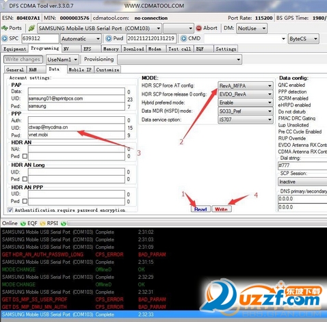 来到data页面,先read读取,然后改ehrpd为reva,再填写ctwap@mycdma.cn