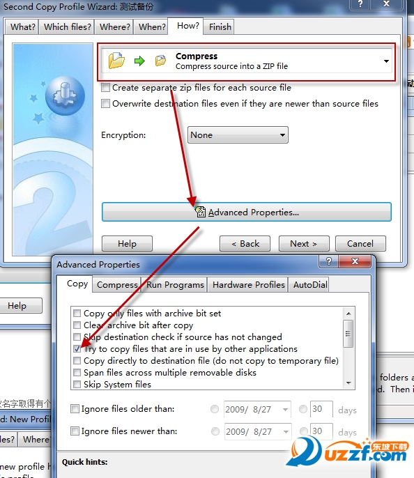 (注意:请选择:Try to copy files that are in use by other applications - 尝试复制正在使用中的文件。