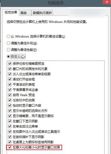 5、在性能选项页面中,取消“在最大化和最小化时显示窗口动画”选项前的对号