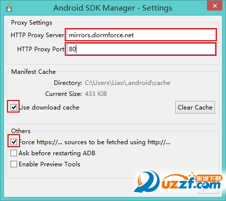 启动 Android SDK Manager ,打开主界面,依次选择「Tools」、「Options…」,弹出『Android SDK Manager – Settings』窗口;照着图中的做即可。这样下载速度会快很多。