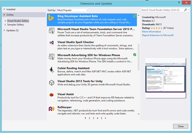 2. 在”扩展和更新“对话框中,选择”在线/Visual Studio Gallery”, 然后搜索并安装Bing Developer Assistant