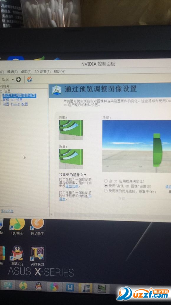 接着就是电池的优化和显卡的优化,具体操作如下:fx50用的是GTX950m的显卡,2g独显,我们要进行显卡优化,首先回到桌面,单击右键有个NVIDIA控制面板的选项,点击在左边的3d设置的子选项中单击“通过预览调整设置”,在右边界面中选择 “使用我的优先级“这个选项,将下方的滑块调整到左边的”性能“。如果你想要更好的图像效果,不用动他也可以。接着左边的”管理3d设置“ 将首选图形处理器下面的下拉三角选为“高性能NVIDIA处理器”然后选择左边的“设置PhysX” 在右边的界面中的“选择PhysX处理器”换成GTX950m,记得每一次修改完后要点击右下的应用来修改设置。