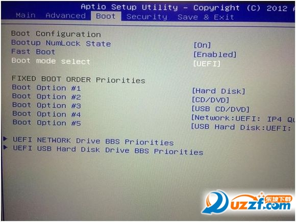 2. 利用左/右键移至 BOOT后,再利用上/下键移至Boot mode select ,按下回车