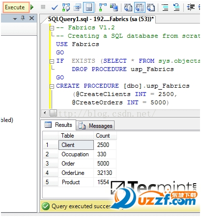 下一步,点击“New Query”打开一个新的查询窗口,然后将来自Codeproject.com的 Fabrics数据库脚本的内容插入到查询窗口,然后单击执行。如果成功,您将看到该脚本创建的5个表和每个表的记录的数量: