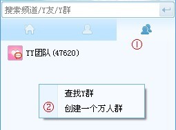 打开YY窗口,选中“Y群”项,然后鼠标单击“创建一个万人群”如下图所示,此时系统弹出“创建群”对话框。