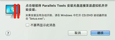 2.点击“继续”以连接Parallels Tools for Windows的ISO镜像到虚拟机CD/DVD-ROM驱动。