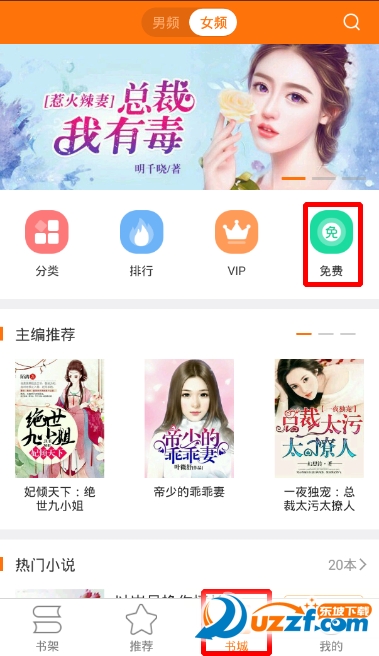 点击书城后,有一个免费栏目,里面的小说全部是免费的。