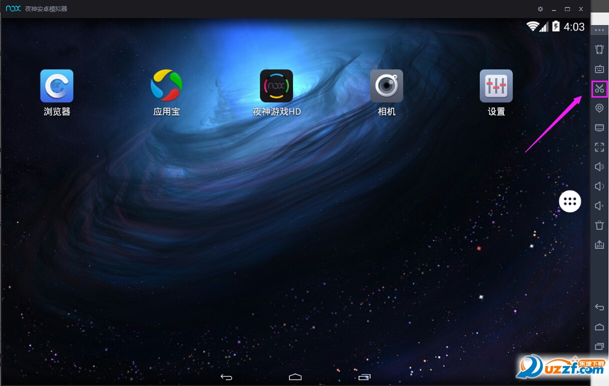 如下方图片所示,点击夜神模拟器右侧的工具栏,剪刀状图标,即可截图。
