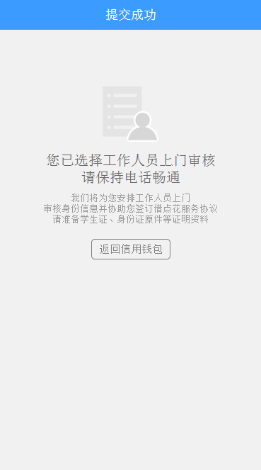 第四步:确认订单后可选择您方便的审核方式,有自提点审核和上门审核两种方式可选。选择后在信用钱包我的订单即可查询到您的订单信息。