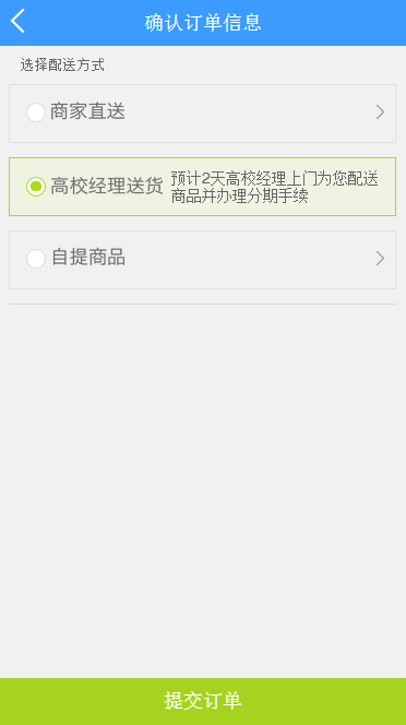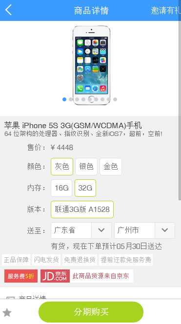 第二步:选择商品属性、首付比例及分期月数后,服务费在内的所有信息都将被准确地展现给您,您可以选择你方便的配送方式,目前有商家直送、送货上门、上门自提这三种方式可选 。