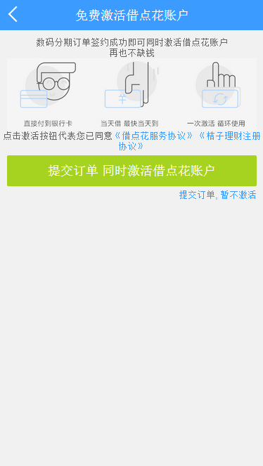 第三步:如果您未开通信用钱包在此处可以点击选择同时激活借点花,如果已经开通可以选择跳过直接点击提交订单,输入您的交易密码即可确定下单。