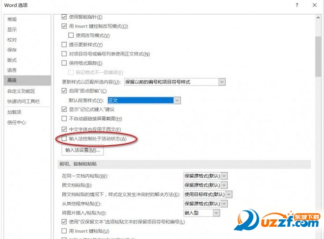 在Word选项窗口中,点击左侧“高级”选项,在右侧窗格中可见“输入法控制处于活动状态”选项处于被选中状态,这时只需将选择框中的对勾取消掉,就可以解决输入法无法切换的问题了。