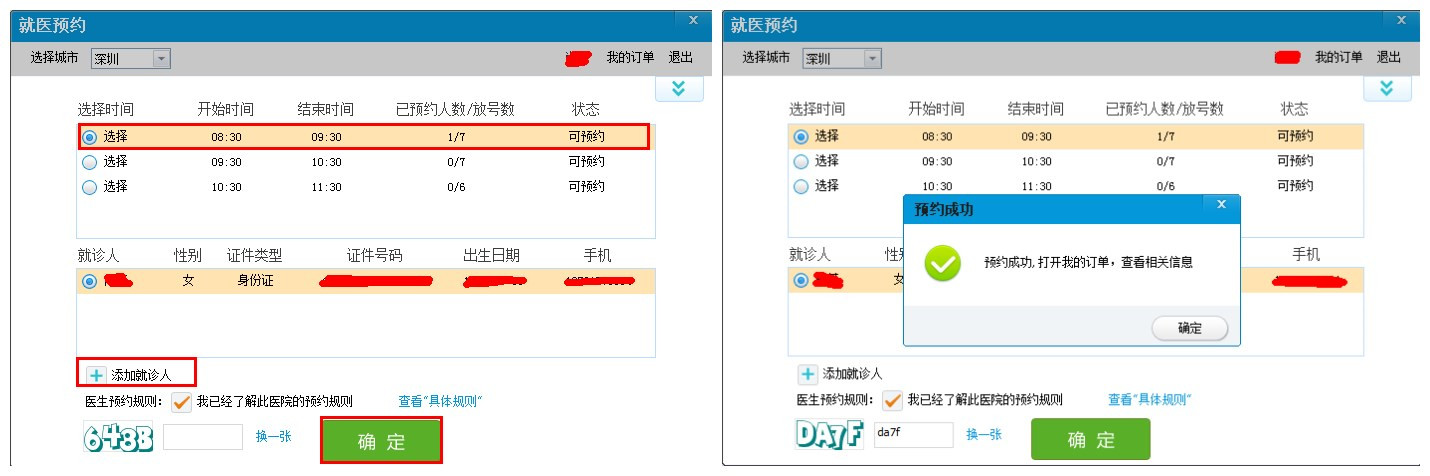 点击可预约之后,页面跳转到具体的预约信息。我们可以选择上午的时间段,系统也会很清楚的告诉我们已预约人数和放号数,并且会显示是否是可预约的状态。页面下方会显示就诊人的信息,如果我们给自己看病预约挂号,就可以选择自己为就诊人,如果我们为家人预约挂号,还可以添加就诊人,点击添加就诊人,输入家人的实名信息就可以了。然后输入验证码。点击确定,系统会提示预约成功,并且手机会同时收到预约成功的信息。到就诊当天拿身份证提前半小时去医院取号。无需再额外排队取号。