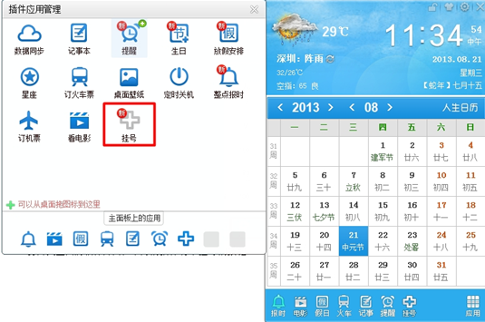打开人生日历应用管理,我们可以看到“预约”的小图标,您可以把它添加到人生日历的主界面,这样就能很方便的在主界面上打开。点击图标,我们就能打开网上预约挂号对话框。