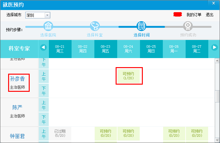 选择医生和时间。点击儿童保健科的体检之后,就可以选择医生和时间了。页面会显示医生的名字以及职位。并且会显示哪个时间段可以预约。如我可以选择孙彦香主治医师,她在8月24号上午可预约20人,现在只有一个人预约,所以我可以预约这个主治医师。点击可预约。