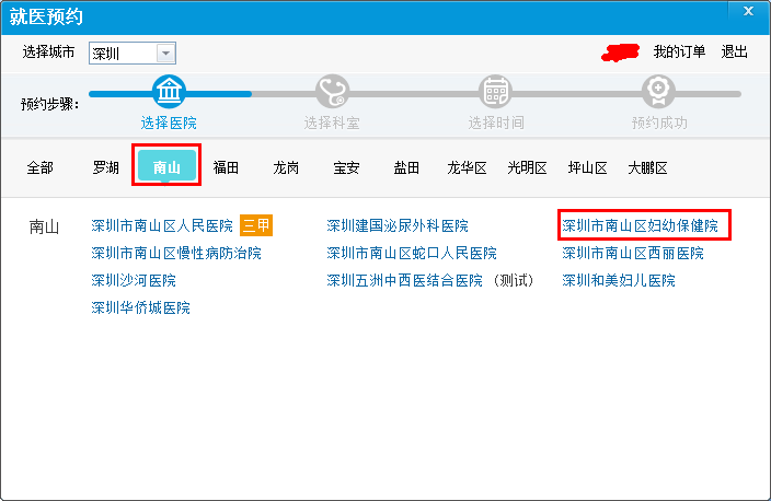 选择医院。例如我想要预约深圳南山区儿科号。我先选择南山区,页面更新到南山区的所有医院,我再选择深圳市南山区妇幼保健院。点击进入。