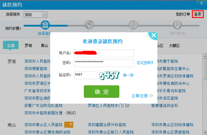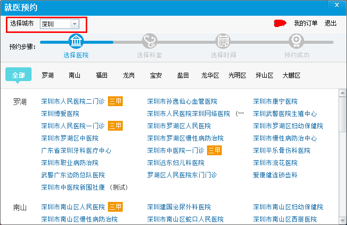 登录之后,在页面左上角下拉列表里选择需要挂号的城市,页面就会自动更新到该城市的医院信息。我们就可以开始预约挂号了。预约挂号有四个步骤。选择医院-选择科室-选择时间-预约成功。