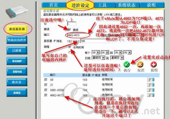 其实做端口映射设置很简单,例如要映射一台内网IP地址为192.168.0.5的WEB服务器,只需把WEB服务器的IP地址192.168.0.5和TCP端口80填入到路由器的端口映射表中就OK了。