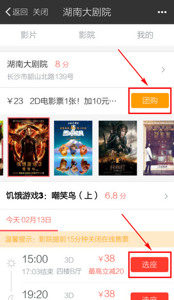 7.选择【团购】或【选座】进行购票操作即可