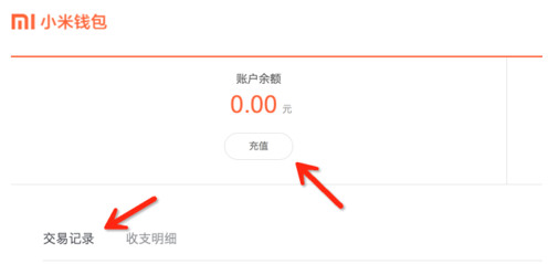 4.登录之后,您可以看到您的余额以及交易记录,点击“充值”按钮可以对小米钱包进行充值操作。