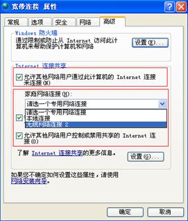 (1)共享“宽带连接”。右击“宽带连接”选择“属性”——“高级”,在“高级”选项中将“Internet连接共享”中“允许其他网络用户通过此计算机的Internet连接来连接”勾选中,在“家庭网络连接”中选择SoftAP对应的无线网络连接,本例为“无线连接2”,选中之后点击“确定”。