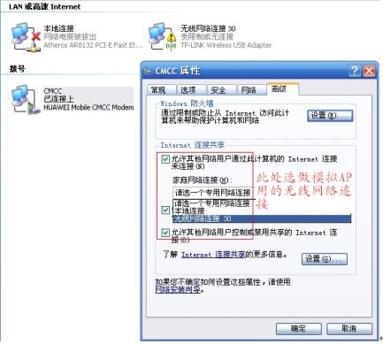 (2)共享“CMCC”3G上网连接。右击“CMCC”选择“属性”——“高级”,在“高级”选项中将“Internet连接共享”中“允许其他网络用户通过此计算机的Internet连接来连接”勾选中,在“家庭网络连接”中选择SoftAP对应的无线网络连接,本例为“无线网络连接30”,选中之后点击“确定”。