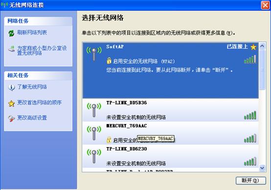 4. 无线连接SoftAP,电脑的无线连接搜索无线网络,选中“SoftAP”,并输入无线安全密钥。