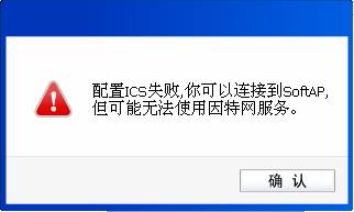 TL-WN721N 3.0、TL-WN725N 1.0、TL-WN727N 3.0以及TL-WDN3321 1.0等无线网卡支持SoftAP功能。开启SoftAP功能,可能会弹出报错信息“配置ICS失败,你可以连接到SoftAP,但可能无法使用因特网服务”。截图如下: