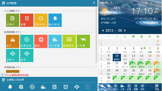 主界面下方常驻日常生活工具小插件,这也是人生日历主打特色,集生活为一体的日历小工具。云记事、日常提醒、桌面壁纸自动换、订购火车、飞机票等等生日小工具集于一身,为打造一个简单的日历工具能够完成日常生活所需,倾心为用户解决软件多、操作繁琐等问题。