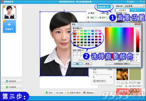 3.单击“完成抠图”后会自动进入抠图换背景界面,单击“背景设置”并选择颜色背景,然后选择颜色背景的颜色并输入需要的背景大小。如图4所示。