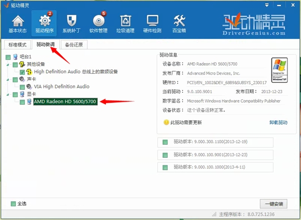 2、用驱动精灵的驱动微调模式重新安装显卡驱动: