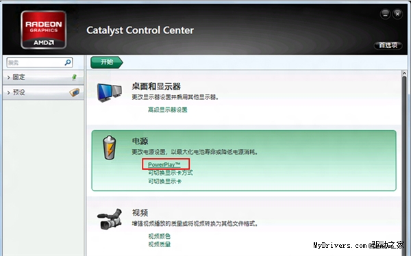 (2) 在弹出的显卡控制面板窗口,点击电源选项下的“PowerPlay”。如下图所示:
