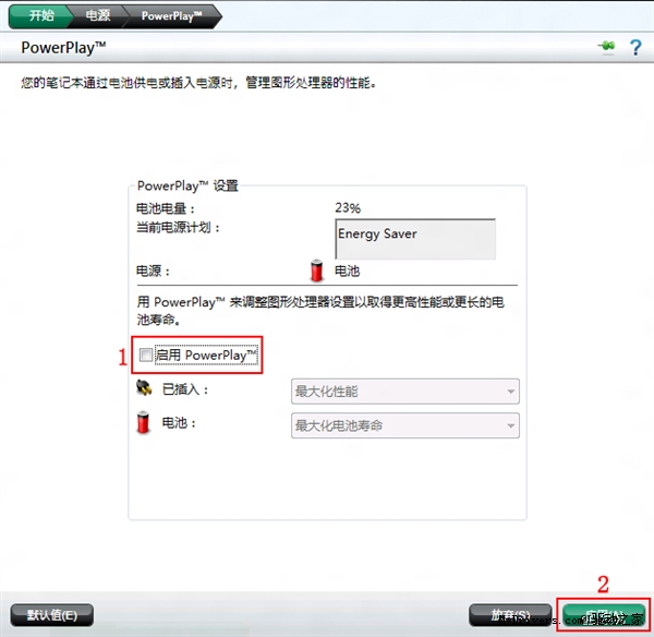 (3) 取消勾选“启用 PowerPlay”选项后点击“应用(A)”按钮。如下图所示: