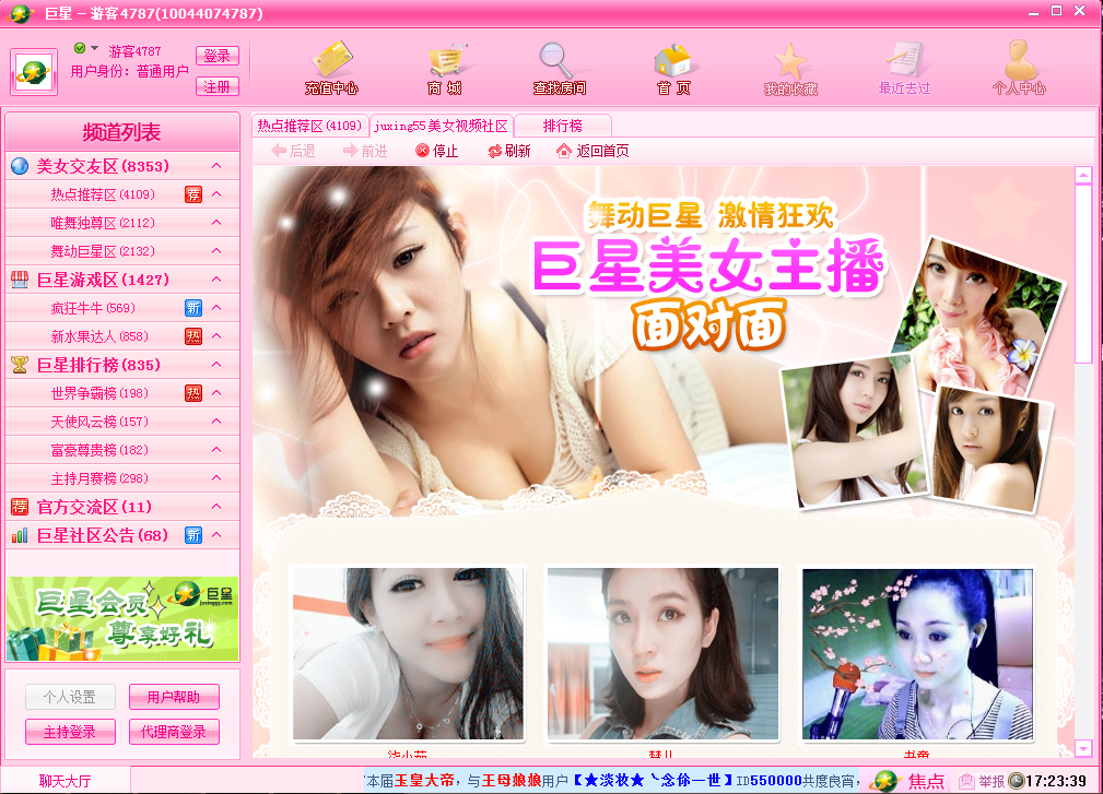 巨星视频提供的百人KTV互动视频聊天,支持百人同时在一个房间,送花献唱、为好友喝彩,秀自己、交朋友、享受光影声色的互动舞台。同时巨星视频社区还提供免费高清晰全视频、全音频沟通,让您和您的朋友,随时随地畅聊无限。另外一对一的私聊,让你可以和好友随心所欲畅聊,可以任意缩放的视频窗。