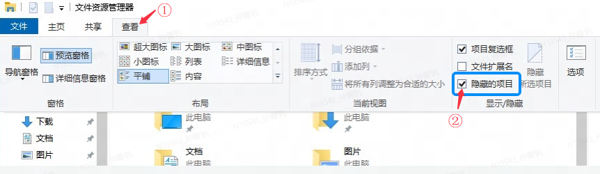 ②第二步,打开“文件资源管理器”后,选择“查看“,并勾选”隐藏的项目“。