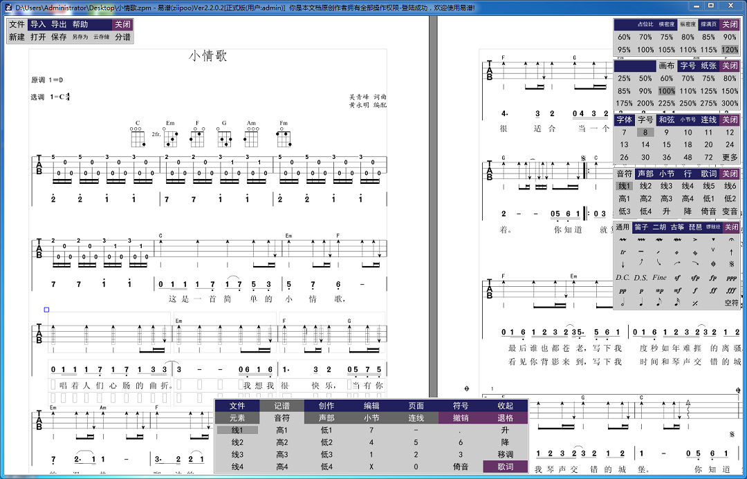 易谱目前支持吉他谱+尤克里里+简谱+歌词+五线谱 混排!