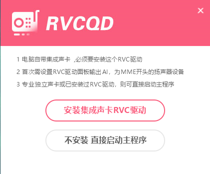 第一步,安装好软件后,第一时间会自动弹出一个RVC驱动安装程序,如下图,如你用的是电脑自带集成声卡,就选择安装,反之点击不安装直接启动主程序按钮即可;